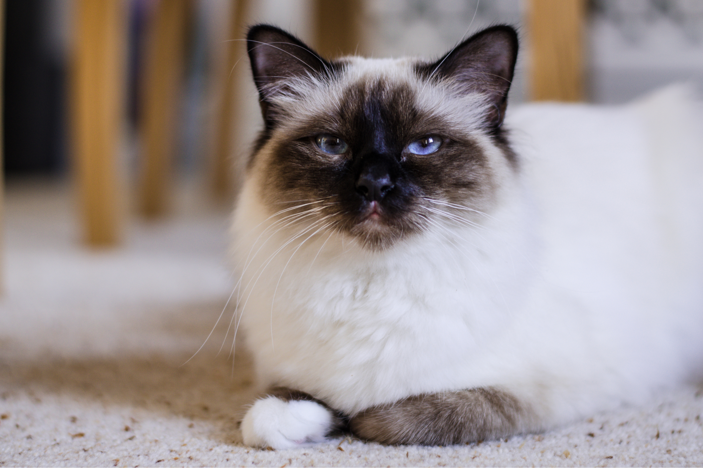 I Gatti Sacri di Birmania sono facilmente riconoscibili grazie al loro mantello semi-lungo e setoso, che non si annoda facilmente come quello dei Persiani. La loro colorazione è unica: presentano un corpo chiaro con sfumature dorate, e hanno punte di colore più scuro (come il marrone, il blu, il cioccolato o il lilla) sul muso, orecchie, zampette e coda. Le zampe bianche, simili ad eleganti guanti, sono una caratteristica distintiva della razza e devono essere simmetriche e pulite. Inoltre, i loro occhi blu intensi, a forma di mandorla, sono ipnotici e contribuiscono notevolmente al loro fascino. Il corpo è di taglia media, con una struttura robusta ma elegante, che esprime potenza e grazia allo stesso tempo.