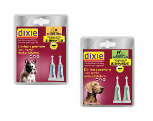 DIXIE PERMETRINA formulato per trattamento e prevenzione contro la parassitosi esterna di pappataci, zanzare, pulci, zecche e pidocchi nei cani. Con una concentrazione molto alta di permetrina (piu di 715 mg) con un basso volume/alta concentrazione, il prodotto si diffonde rapidamente con l’effetto insetticida.