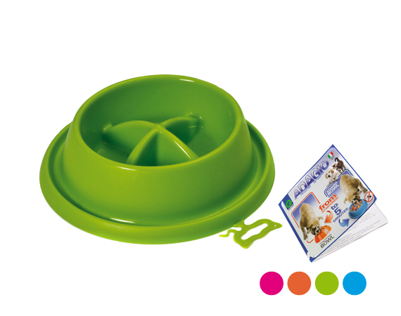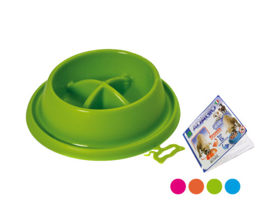 La ciotola Adagio è una ciotola anti-ingozzamento che rallenta l’assunzione di cibo e la masticazione del cane, ed è per questo motivo raccomandata dai veterinari. Aiuta l’animale a mangiare più correttamente favorendo il senso di sazietà e migliorando la digestione riducendo quindi il rischio di gonfiore e torsione dello stomaco e dell’intestino, riduce l’aria nello stomaco, le flautolenze e il vomito.