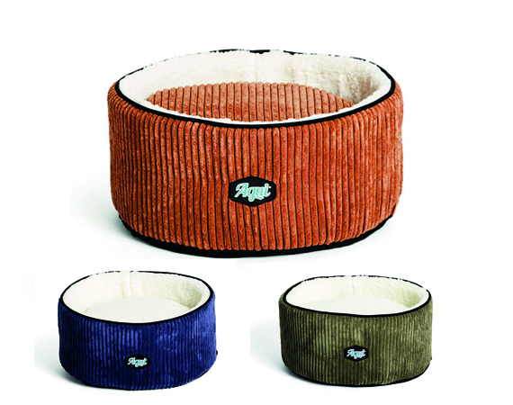 Cuccia rotonda rivestita in morbido velluto a coste verticali con interno a contrasto in morbida finta lana.