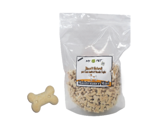 La particolare formulazione di MY PET Biscotti Naturali -Maintenance Mini- per cani adulti di piccola taglia, permette un bilanciato apporto di elementi nutrizionali ad elevato valore biologico. Il prezioso mix di farine vegetali, e non di origine animale, infatti, oltre a garantire una straordinaria appetibilità, è stato studiato per migliorare lo stato generale dell’animale, secondo le esigenze di un cane adulto di piccola taglia (Medicina Olistica). Il tuo cane quindi sarà più agile, sano e felice anche attraverso l’utilizzo di questi speciali biscotti. L’alta qualità, garantita tra l’altro dalla naturalezza degli ingredienti, permette un adeguato mantenimento della massa muscolare, abbinato ad un perfetto equilibrio psico-fisico del nostro compagno a quattro zampe.